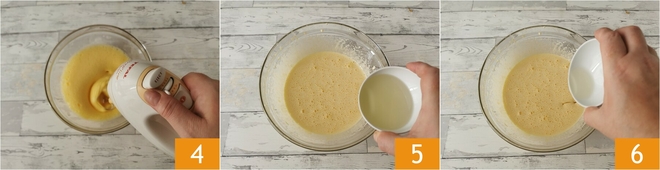 Continue whipping with the electric mixer 4 until you get a stable mixture. Then add the oil all at once 5 6.
