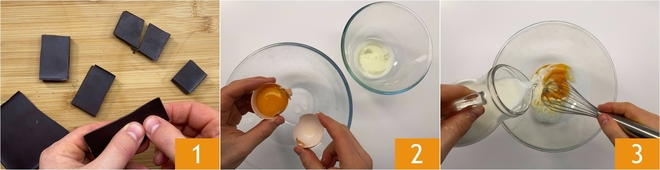 To prepare the chocolate-filled pancakes, first break the chocolate bar into 8 equal pieces 1. Set them aside and meanwhile melt the butter and let it cool. In the meantime, separate the egg whites from the yolks into two different bowls 2. Beat the yolks with a whisk, and while continuing to mix, add the milk in a slow stream 3.