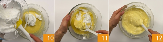 gently incorporate them into the egg mixture 10 with movements from top to bottom 11 to avoid deflating them 12.