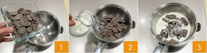 To prepare chocolate fondue with strawberries, melt the dark chocolate in a double boiler: pour it into a heatproof bowl placed in a pot half-filled with water 1. Turn on medium heat and add the already hot cream (2-3) gradually to the chocolate.