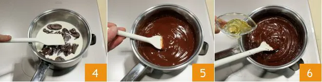 Stir with a wooden spatula 4 to mix the ingredients and completely melt the chocolate 5. Once the mixture is uniform, you can add the brandy 6, or another liquor of your choice, stir and continue cooking for a few more minutes on very low heat: you should get a velvety mixture.