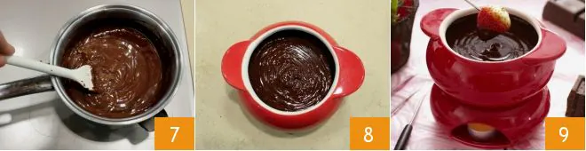 Once ready 7, turn off the heat and transfer the melted chocolate into the special container with the burner underneath 8 to keep everything warm. Wash and dry the strawberries and, without removing the stem, place them on a small plate. To enjoy the fondue, you can take the strawberries between your fingers and dip them directly into the chocolate, or use the special steel forks that are usually sold with the fondue set 9. If you prefer, you can use long toothpicks to enjoy chocolate fondue with strawberries.