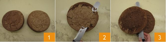 When the sponge cakes are completely cool, you can unmold them 1. Take the first one, remove the top crust using a long-bladed knife 2 and divide it in half 3.