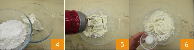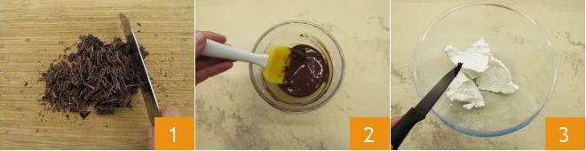 At this point, you can prepare the cream: chop the chocolate 1 and melt it in the microwave or in a bain-marie. Then place the ricotta in a bowl, along with the vanilla bean seeds 3