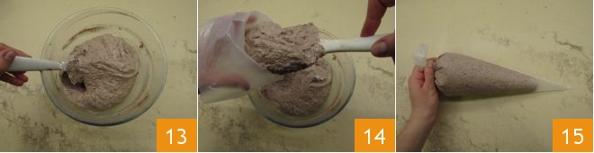 As soon as you have obtained a homogeneous and airy cream 13, transfer it to a pastry bag without a nozzle (14-15) and place it in the refrigerator.
