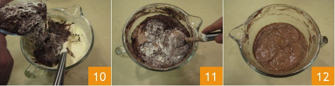 Add the dry ingredients to the batter little by little 10 and continue to mix from bottom to top 11 until they are completely combined 12.