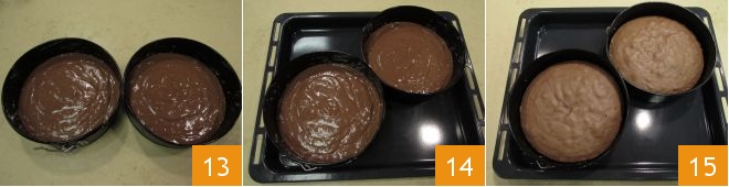 Grease 2 molds with a diameter of 9 inches, then pour the batter inside and level the surface with a spatula 13. Bake both cakes 14 on the center rack in a preheated static oven at 350°F for about 30 minutes; to check the doneness, you can do the toothpick test: if it comes out moist, the cake will need a few more minutes of baking, otherwise, it will be ready. Remove the two sponge cakes from the oven and let them cool completely 15.