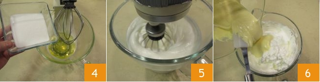 Set aside and whisk the egg whites with the remaining sugar 4 until the mixture is white and frothy 5. Incorporate the yolks into the egg whites little by little 6,