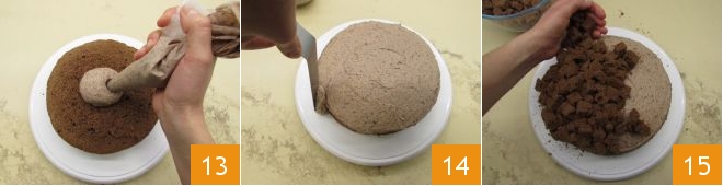 Take the cake from the fridge and cover it with the remaining cream 13, using a spatula to spread the cream evenly on both the surface and the edges 14. At this point, cover it with the cocoa sponge cake cubes made earlier 15