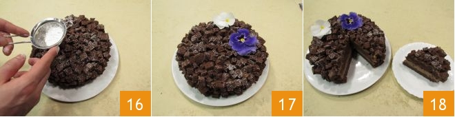 to cover it completely, leaving no empty spaces 16. Dust with powdered sugar and decorate with edible flowers as desired 17. Serve your chocolate mimosa cake 18!