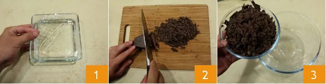 To prepare the chocolate mousse with a hint of vanilla, soak the gelatin sheets in a bowl with cold water for 10 minutes 1. Chop the dark chocolate with a knife 2 and place it in a large bowl 3.