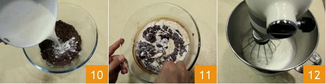 At this point, turn off the heat and gradually pour the hot milk over the chopped chocolate 10 and stir with a spatula 11 until completely melted. Let everything cool down, then whip the cream 12;