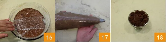 Cover the mousse with cling wrap in contact 16 and let it chill in the refrigerator for at least 2 hours. After the required time, place the mousse into a pastry bag with a star tip 17 and pipe it into small glasses that you can decorate with small tufts: your chocolate mousse with a hint of vanilla is ready to be served and enjoyed 18!