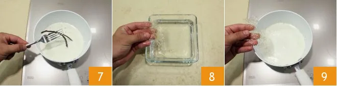 Let it infuse until the milk is about to boil, then remove it 7. Squeeze the gelatin sheets with your hands 8 and add them to the hot milk 9 to dissolve completely.