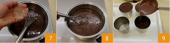 Squeeze the gelatin sheets well and add them to the mixture 7, then mix with a whisk until they are completely dissolved 8. Turn off the heat and pour the mixture into 5 molds 9 and let them set in the refrigerator for at least 4 hours.