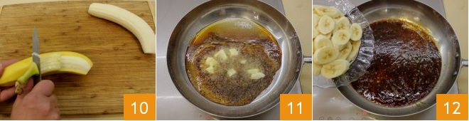 In the meantime, prepare the caramelized bananas: peel them 10, then in a pan or double-bottomed pot melt the butter with the sugar over very low heat 11, stir with a wooden spatula when melted and cook over very low heat until the caramel reaches an amber color. At that point, add the banana sliced into rounds about half a centimeter thick 12.