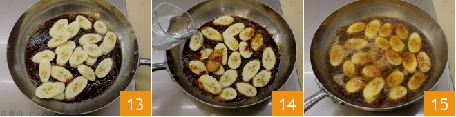 Distribute them evenly in the pan and cook for about 1 minute 13, then slowly add water 14 and cook for another couple of minutes 15, until evaporated.