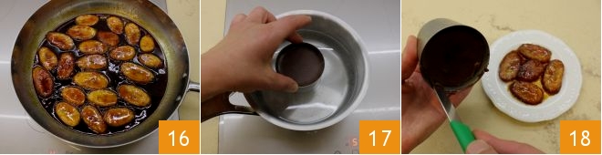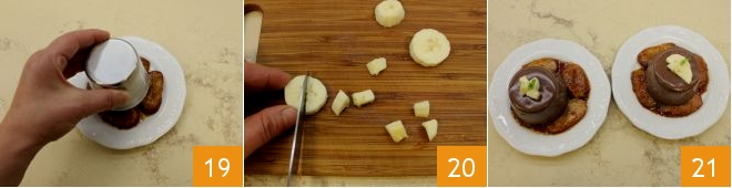 Turn off the heat 16 and distribute the caramelized bananas on serving plates. Then take the panna cotta out of the refrigerator and to unmold them more easily, dip the molds for a few fractions of a second in a pot of hot water 17. Use a small knife to detach the edges more easily 18