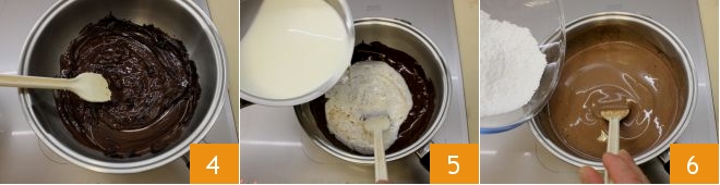 Melt the chocolate in a double boiler by placing it in a bowl or putting a saucepan in another pot filled with water, making sure that the water does not touch the container with the chocolate. Stir to melt it completely 4, then add the heated cream 5 and the sifted powdered sugar 6. Continue stirring with a spatula and heat everything over low heat without bringing it to a boil, continuing to stir to prevent the chocolate from forming lumps.