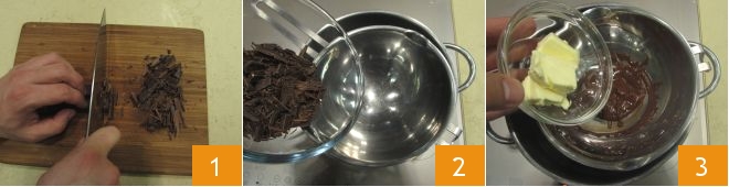 To prepare the pudding with raspberry coulis, start by chopping the dark chocolate 1 and melt it in a bain-marie (you can use a bowl placed over a saucepan with boiling water, ensuring the water does not touch the bottom of the bowl) 2. Add the butter 3 and stir to fully melt the mixture.