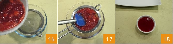 Strain the obtained pulp 16, using a soft spatula 17 (it's preferable not to use an immersion blender because breaking the seeds of the strawberries and raspberries might make it more sour). You can divide the coulis into small containers to serve it with each pudding 18.