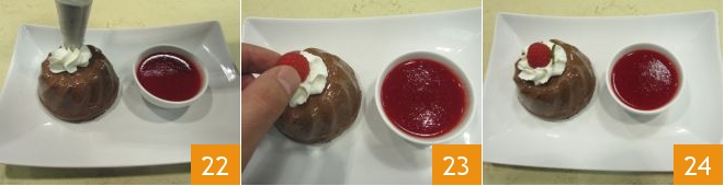 When the pudding has solidified, run a small knife around the edge to make it easier to remove from the mold 19; turn the pudding onto a serving plate 20. Then whip the fresh cream with an electric mixer 21 or in a stand mixer and place it in a piping bag. Decorate the pudding with a dollop of whipped cream, decor with a fresh raspberry, and serve with the coulis on the side: your pudding with raspberry coulis is ready to be served.