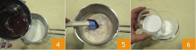 Bring the milk to a boil in another saucepan and when it is about to boil, remove it from the heat and add the melted chocolate 4, stirring with a whisk or spatula 5. In a small bowl, mix the sugar with the cornstarch 6