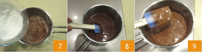 and pour them, always stirring, into the chocolate and milk mixture 7. Put the saucepan back on the heat and continue to stir until the cream slightly thickens and coats the spatula (8-9).