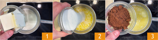 To prepare the chocolate salami cake, first focus on the base. Heat the milk in a saucepan, then add the butter 1, sugar 2, and cocoa 3.