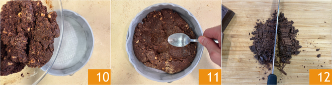 Pour everything into a 9-inch springform pan lined with parchment paper 10. Press and level with your hands or a spoon 11, then place in the refrigerator for at least 3 hours. Meanwhile, prepare the glaze by chopping the dark chocolate with a knife 12 and transferring it to a bowl.