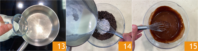 Pour the cream into a saucepan 13 and bring to a boil, then add it to the chocolate 14, stirring with a whisk until it melts 15. Allow to cool until the glaze has slightly thickened.