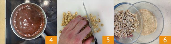 Stir with a whisk to combine all the ingredients and bring to a boil 4. Turn off the heat and let it cool. Meanwhile, crumble the biscuits in a bowl to obtain a rustic mixture with not too large crumbs. Coarsely chop the hazelnuts 5 and add them to the bowl 6.