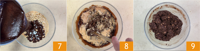 Also add the now lukewarm milk and cocoa mixture 7 and stir thoroughly 8 to obtain a fairly solid dough 9.
