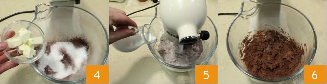 To prepare the chocolate scones, place the sifted flour 1 and cocoa 2 in the bowl of a stand mixer fitted with a paddle. Add the sugar 3 and baking powder.