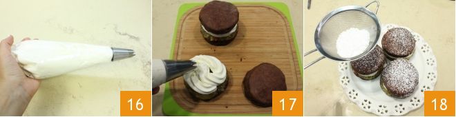 When the cream is well whipped, transfer the mixture into a piping bag with a star tip 16 and fill the scones with the cream, close them like a sandwich 17, and serve them dusted with powdered sugar 18.