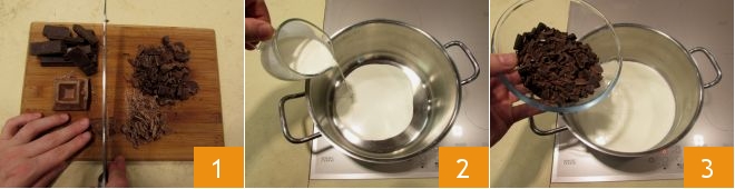 To prepare the chocolate truffles, start with the Ganache cream. Chop the dark and milk chocolate with a knife 1. Place a large pot with the cream on the stove 2; when the cream starts boiling, remove it from the heat and pour in the dark chocolate 3.