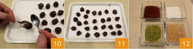 Then start forming your truffles: take small portions of chocolate mixture (about 0.5 ounces) and with the help of 2 spoons (or with your hands, remembering to moisten them before proceeding) form small balls 10. As you work them, place the truffles on a tray lined with parchment paper that you will put in the refrigerator for at least 30 minutes: with our quantities, you should obtain 40 truffles 11. After the necessary time, place the hazelnut and pistachio crumbs, the grated coconut, and the cocoa powder in 4 small bowls to make the coating 12.