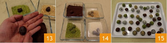 Roll each truffle in the bowl with the coating 13, ensuring it adheres evenly 14. Finally, serve the chocolate truffles in small silver paper cases 15, accompanying them with a good coffee or hot tea.