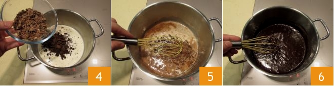 At this point, add the previously chopped milk chocolate 4. Stir with the whisks 5 and let everything melt completely. Keep mixing until you get a creamy and lump-free mixture 6.
