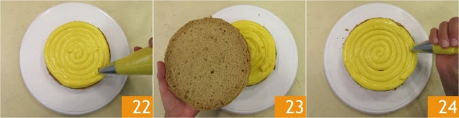 Take the cream from the refrigerator, give it another stir, and transfer it into a pastry bag with a 1 cm plain tip. Place the first sponge cake disk on a serving plate and fill it with half of the custard 22, then cover with the second disk 23 and add the remaining cream 34.