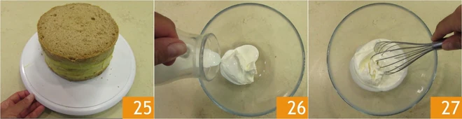 Place the third sponge cake disk on top, straighten the cake and smooth the edges with a spatula, then put it in the refrigerator for at least 30 minutes 25. Meanwhile, prepare the topping: pour the cream cheese into a bowl, add the cream 26 and mix with a whisk to obtain a smooth and homogeneous cream 27.
