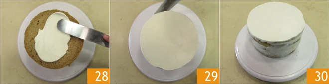 After the cooling time, cover the surface of the cake with a light layer of cream using the spatula 28, including the sides 29.