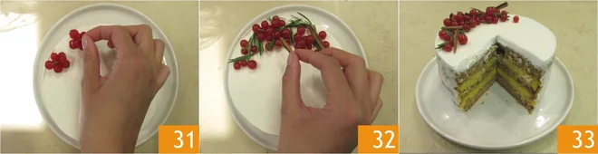Finally, garnish the surface with currants 31, rosemary needles, and cinnamon sticks 32. Your Christmas naked cake is ready to be served 33!