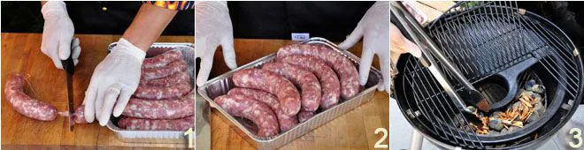 First, it is necessary to remove the string from the sausages 1 (if still present) and cut them to handle each sausage individually 2. The sausages should not be pierced before, during, or after cooking. The openings at the ends will suffice to drain excess fat. The grill should be set up for indirect cooking. When the coals are ready, throw water-soaked cherry chips 3 onto the coals for at least 30 minutes. Close the lid and wait for the smoke to be produced.