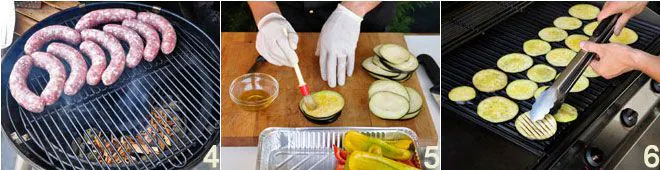 At this point, place the sausages on the grill 4 away from the heat source, ensuring some space between each one to allow the smoke to pass through. Close the lid, stabilize the temperature at 340°F, and smoke for an hour, adding wood chips and/or already lit charcoal to maintain the grill's temperature. Once the temperature is stabilized, grill the vegetables in the classic method: simply by thinly slicing, brushing with excellent extra virgin olive oil 5, and grilling at very high heat for a few seconds (6-7).