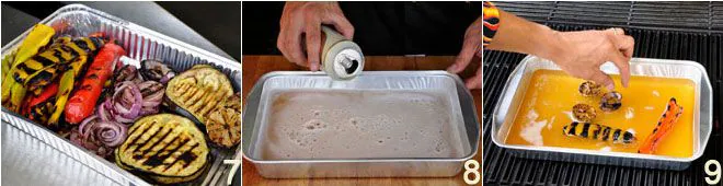 15 minutes before finishing the sausage cooking, fill an aluminum tray with beer 8. Add the grilled lime and some vegetables 9. Place it on the grill or stove and bring it to a boil. Let it simmer until the sausages are ready. If smoked correctly, the sausages should appear a deep garnet red color and should have a strong smoked flavor.