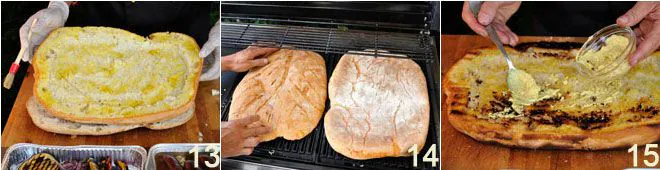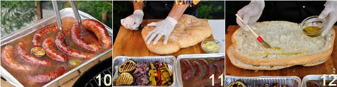 Once these characteristics are achieved, remove them from the grill and soak them in the beer 10. The beer will maintain a very high moisture level and provide a slight flavor surplus that will pleasantly surprise you. While the sausages remain warm in the beer bath, prepare the ciabatta. Open it 11, remove any excess crumb, if necessary, and brush it with extra virgin olive oil (12-13)