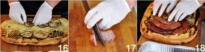 Begin stuffing the sandwich with eggplants 16. Split the sausages lengthwise 17 and place them on top of the eggplants (18-19).