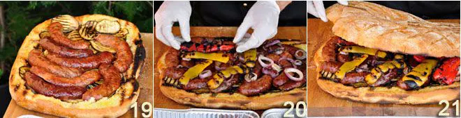 Next, add the grilled peppers and onion on top of the sausages 20, close the top 21, and all that's left is to serve it to our guests, perhaps accompanied by a nice cold beer (but not ice-cold). A simple, rustic preparation with intense flavors. Also ideal for an autumn barbecue. The smoked sausages will amaze you.