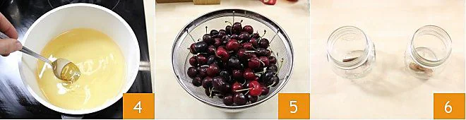 To prepare the cherries in syrup with Port and cinnamon, first, you need to get glass jars for preservation and proceed with their sanitization as indicated in the guidelines from the Ministry of Health provided at the end of the recipe. Start by carefully washing the jars under running water 1. Line a large pot with high sides with a clean dish towel and place the jars inside the pot. Then wrap one or more towels around the jars to prevent them from bumping 2. Fill the pot with water until the jars are covered. Bring to a boil, then lower the heat and leave the jars in the pot for another 30 minutes. Ten minutes before draining the jars, also immerse the lids to sterilize them. After the necessary time has passed, turn off the heat and let it cool. When the water has reached room temperature, take the jars out of the pot and let them drain on a cloth 3.